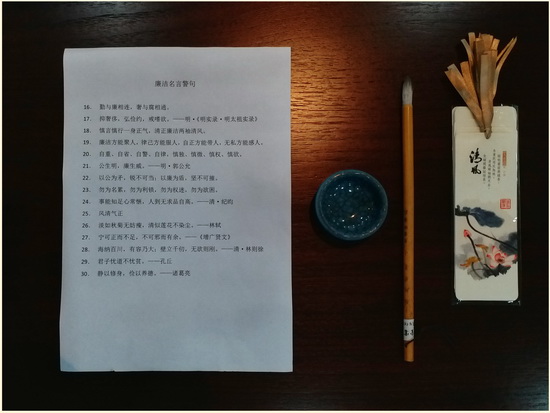 胸中有正氣,筆墨畫清風(fēng)。本次活動(dòng)以空白書簽為載體,在書簽空白面書寫廉潔名言、警句。蘇書記、張書記帶頭親自書寫制作了廉潔書簽。參加人員發(fā)揮所長,認(rèn)真在書簽上書寫廉潔名言、警句,行書、草書、楷書、隸書,毛筆、硬筆齊飛舞,用心書寫每一筆。有的還配了畫呢!活動(dòng)制作的廉潔書簽,將由公司紀(jì)委贈(zèng)送到公司黨員、管理人員及關(guān)鍵崗位人員手中。張書記說:“這些廉潔書簽猶如一把微型的尺子,時(shí)刻提醒我們要牢記自己的職責(zé),時(shí)刻繃緊廉潔自律這根弦,不碰紀(jì)律警戒線,不觸法律高壓線?!?